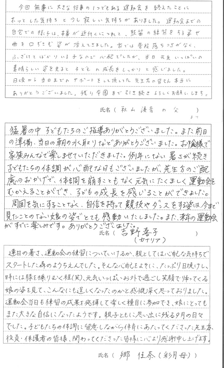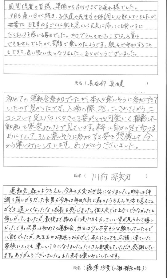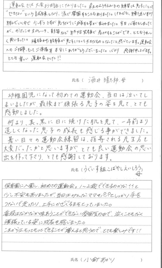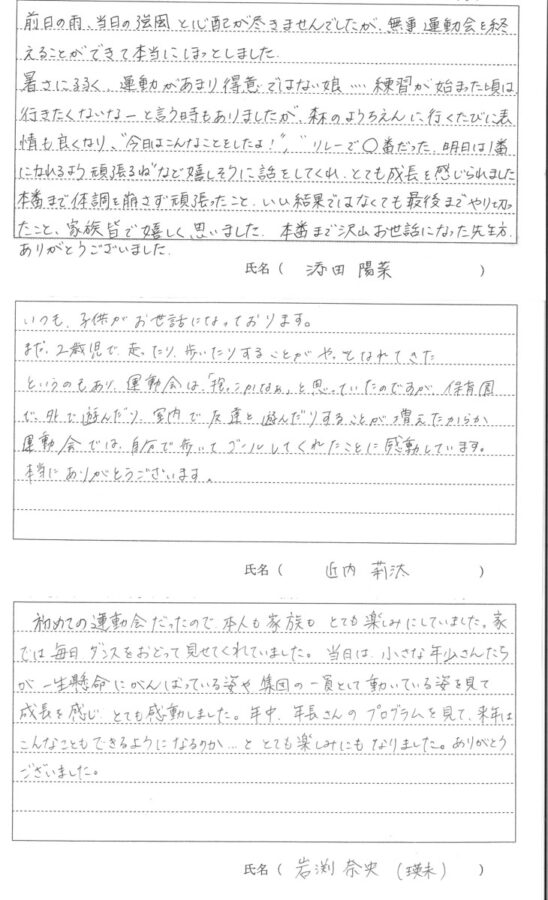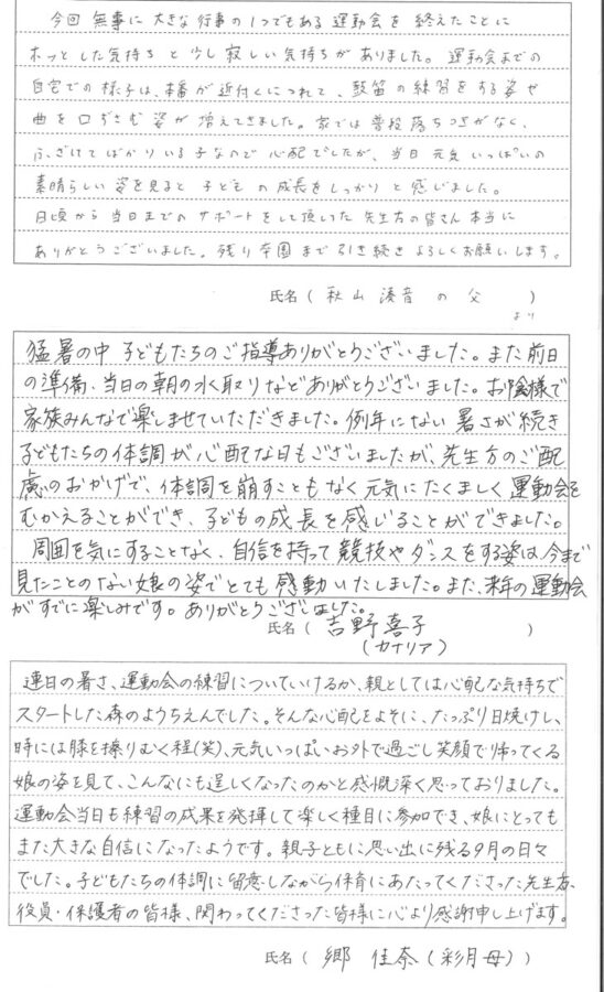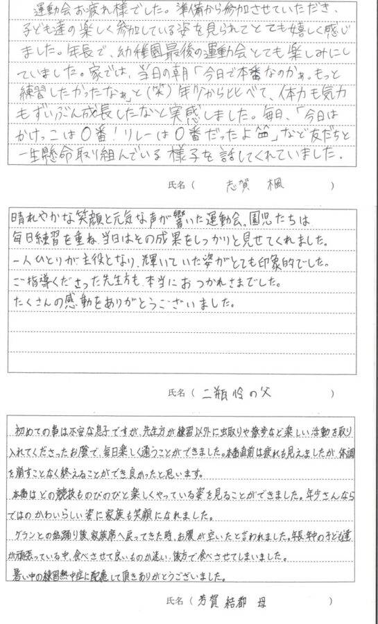 令和7年度 第56回秋の大運動会が9月21日(日)に開催されました。保護者の方に運動会についての感想を書いていただきました。その一部をご覧ください。